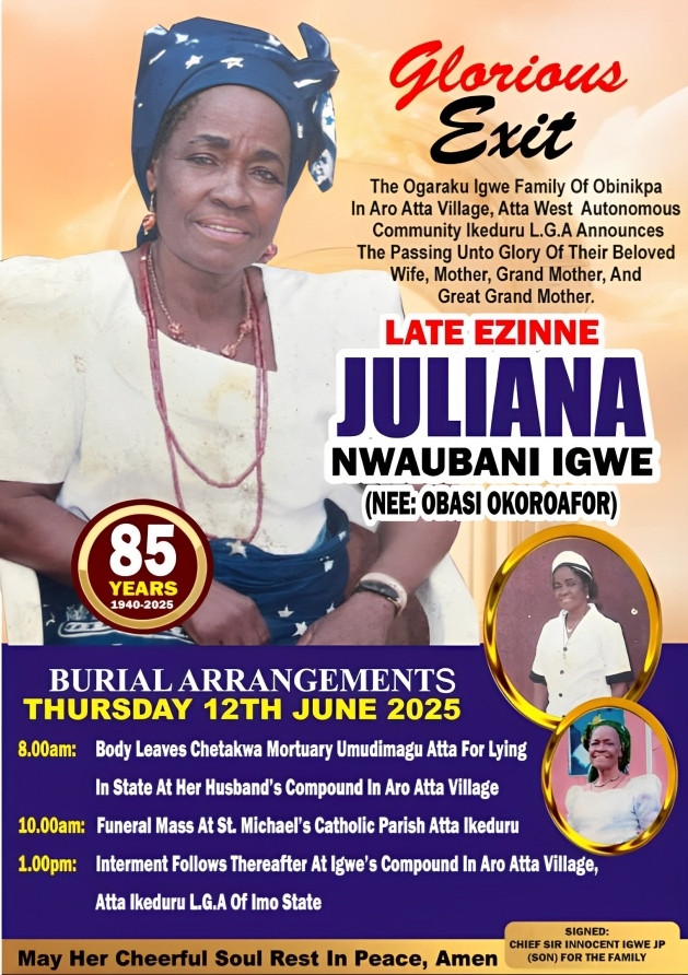 The former Chairman of the Nigeria Union of Journalists (NUJ) in Imo State, Mr. Innocent Igwe,JP has announced the funeral arrangements for his late mother, Ezinne Juliana Nwabuani Igwe (née Obasi Okooroafor).