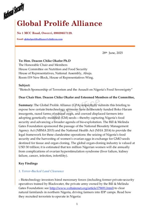 In a letter addressed to Hon. Deacon Chike Okafor, Chairman of the House Committee on Nutrition and Food Security, and dated June 28, 2025, Dr. Njemanze stated, “Certain biotechnology sponsors have deliberately funded Boko Haram insurgents, razed farms of natural crops, and coerced displaced farmers into adopting genetically modified (GM) seeds. This deliberate act captures Nigeria’s food security and promotes a broader agenda of bio-exploitation.”