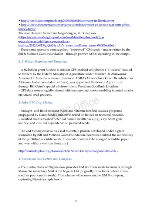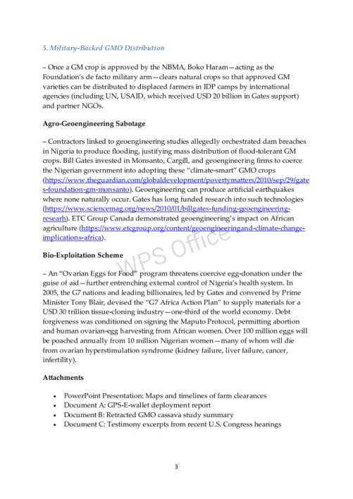 “The Foundation sponsored the passage of the National Biosafety Management Agency Act (NBMA 2015) and the National Health Act (NHA 2014), creating the legal framework for seizing Nigeria’s food security. These laws have facilitated the harvesting of women’s ovarian eggs in exchange for GMO seeds, destined for tissue and organ cloning,” he explained.