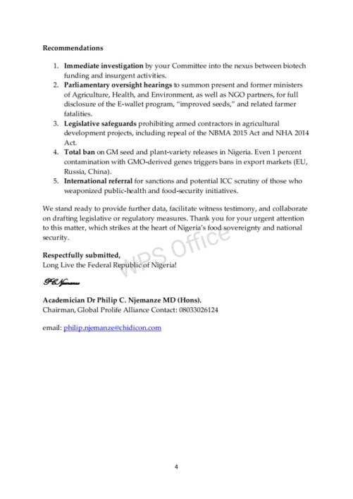 “The use of insurgency to destroy natural crops and force farmers into adopting GM seeds is a deliberate strategy to dominate Nigeria’s agricultural sector and control the nation’s food supply chain. This is nothing short of economic terrorism.”part of the letter read.