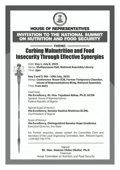 The House of Representatives Committee on Nutrition and Food Security is set to hold a three-day National Summit on Nutrition and Food Security from Tuesday, July 8 to Thursday, July 10, 2025.