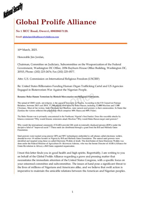 In a letter addressed to Honorable Jim Jordan, Chairman of the U.S. House Committee on Judiciary’s Subcommittee on the Weaponization of the Federal Government, GPA President, Academician Dr. Philip Njemanze, alleged that “U.S. billionaires are funding a human organ trafficking cartel while American agencies are engaged in bioterrorism war against the Nigerian people.”