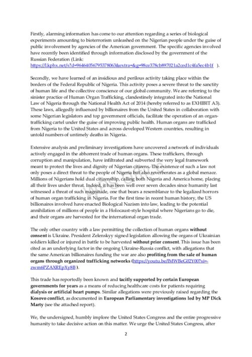 The GPA letter also described what it termed a “sinister practice of human organ trafficking” legalized in Nigeria through the National Health Act of 2014. Njemanze alleged: “This law, allegedly influenced by U.S. billionaires in collaboration with some Nigerian legislators and top officials, facilitates an organ-trafficking cartel under the guise of improving public health.”