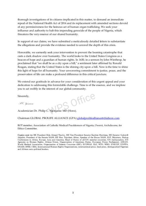 GPA called on the U.S. Congress to investigate and act decisively, urging an immediate repeal of the National Health Act of 2014. “We seek your influence and authority to halt this impending genocide of the people of Nigeria, which threatens the very essence of our shared humanity,” Njemanze wrote.