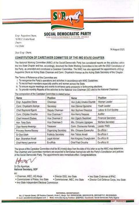 “The National Working Committee (NWC) of the Social Democratic Party has considered reports on the activities within the Imo State Chapter and has, accordingly, dissolved the State Working Committee in line with the 2022 Constitution of the Party, as amended and constituted a Caretaker Committee,” the letter declared.
