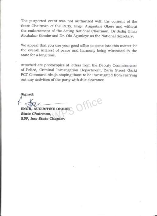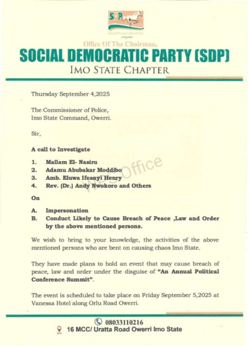 The Imo State chapter of the Social Democratic Party (SDP) has petitioned the Commissioner of Police, alleging that some individuals, backed by former Kaduna State Governor, Nasiru El-Rufai, are plotting to cause chaos in the state under the guise of holding a political summit.