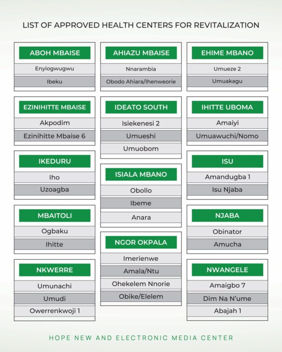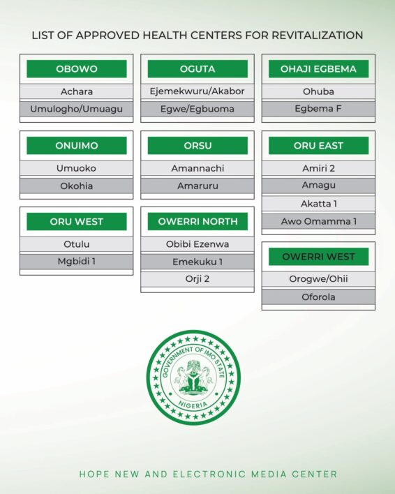 The 55 health centers are spread across LGAs such as Aboh Mbaise, Ahiazu Mbaise, Ehime Mbano, Ideato South, Ikeduru, Ngor Okpala, Njaba, Nkwerre, Nwangele, Obowo, Oguta, Ohaji Egbema, Orsu, Oru East, Oru West, Owerri North, Owerri West, and several others.