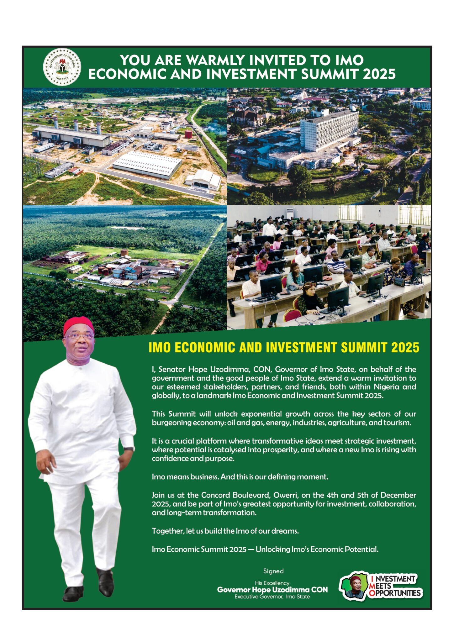 I, Senator Hope Uzodimma, CON, Governor of Imo State, on behalf of the government and the good people of Imo State, extend a warm invitation to our esteemed stakeholders, partners, and friends, both within Nigeria and globally, to a landmark Imo Economic and Investment Summit 2025.
