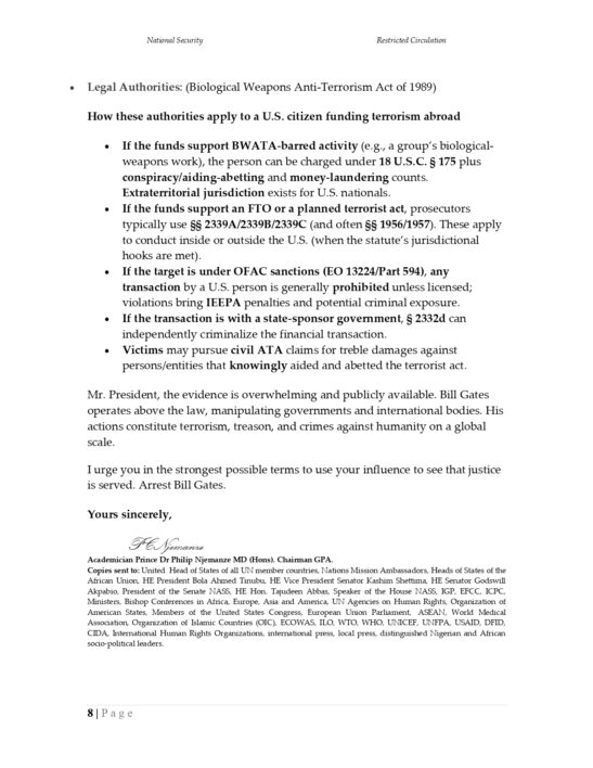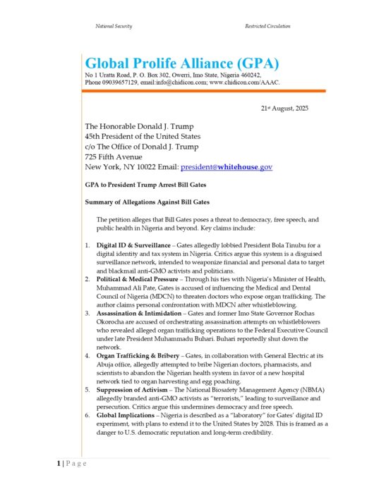 The Global Pro-Life Alliance (GPA) has accused foreign-backed mercenary networks of staging high-profile attacks on Christians in Nigeria to falsely implicate Muslim extremists, insisting the violence is part of a wider plot tied to biotechnology interests allegedly linked to Bill Gates. The claims are contained in a petition sent to U.S. President Donald Trump by GPA’s leader, Dr. Philip Njemanze.