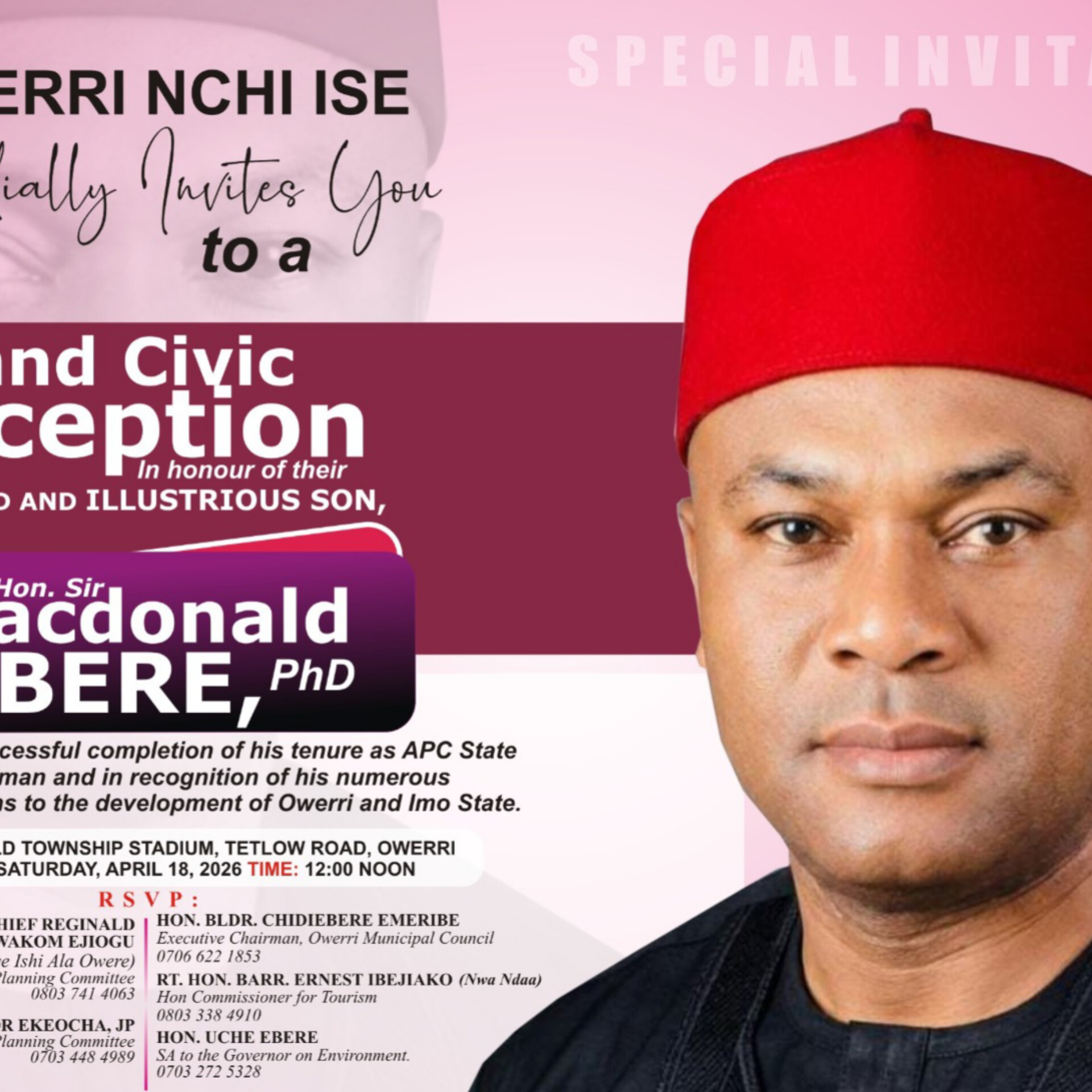 The event, billed as a high-profile gathering of political leaders, stakeholders and community figures, is scheduled to hold on Saturday, April 18, 2026, at the Old Township Stadium along Tetlow Road in Owerri.