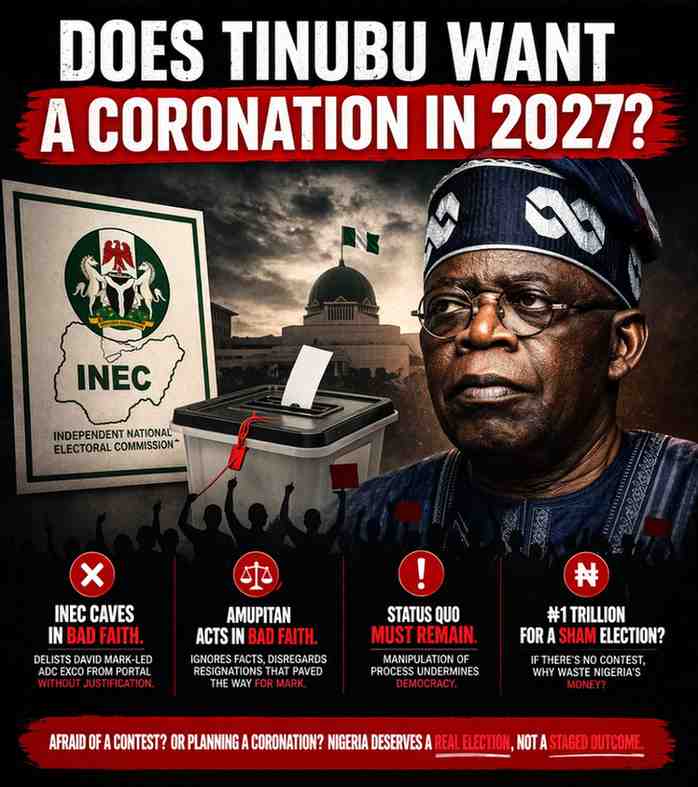 There is something deeply troubling about the latest developments around Nigeria’s electoral process, and it compels an urgent question: is President Bola Ahmed Tinubu preparing for a democratic contest in 2027, or scripting a coronation? Because the signals emerging are not those of a government confident in its popularity, but of one increasingly wary of open competition.