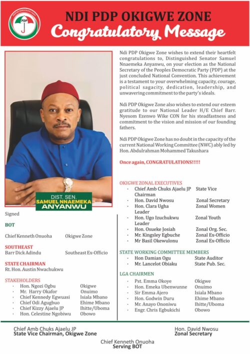 The Peoples Democratic Party (PDP) in Okigwe Zone has congratulated Senator Samuel Nnaemeka Anyanwu on his emergence as the National Secretary of the party, describing his election as a reflection of his political capacity, leadership credentials and long-standing commitment to the PDP.