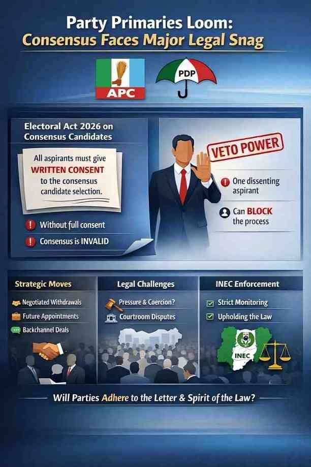 As political parties prepare for primaries ahead of the general elections in 2027, the consensus method is emerging as the preferred mode of candidate selection, particularly within the ruling All Progressives Congress (APC). Yet, a significant legal hurdle threatens to complicate what has traditionally been a smoother path to nomination.