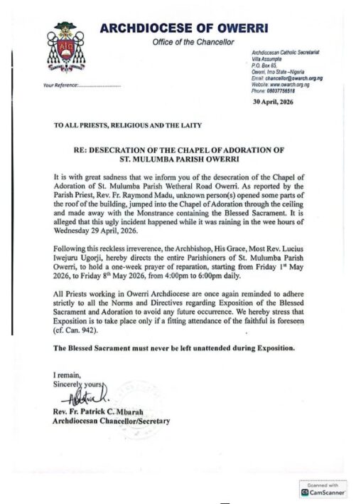 Following the development, Most Rev. Lucius Iwejuru Ugorji directed all parishioners of St. Mulumba Parish to embark on a one-week prayer of reparation.